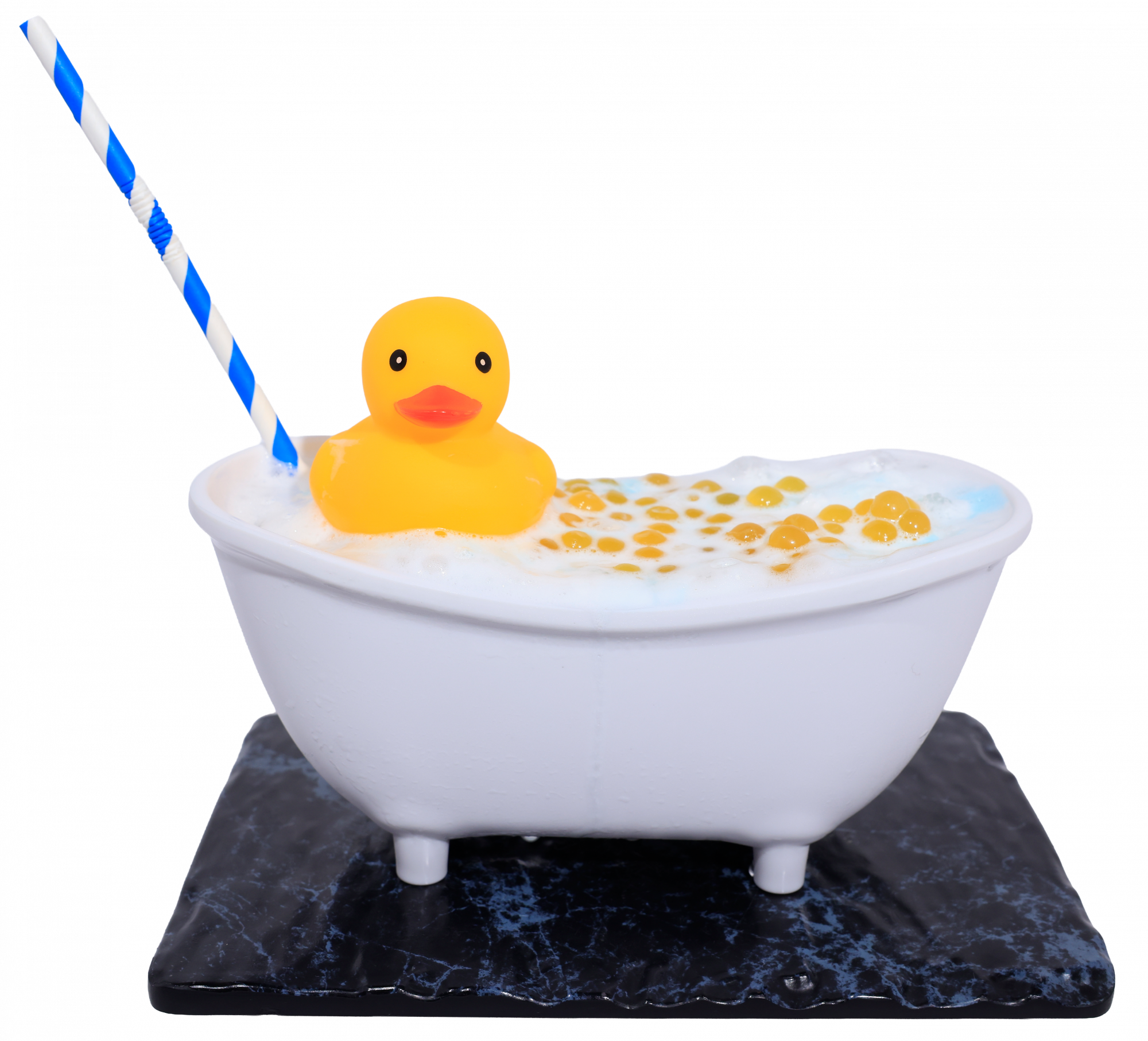 Blue Curacao syrup + lemonade + homemade lemonade + home-made lemon sorbet + mango bubble + Mini duck (not edible!)